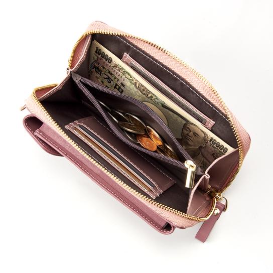 - ファスナー式開閉、カード入れ×4 、札入れ×2、オープンポケット×2 、ファスナー式小銭入れ×1、ホック式スマホ入れ×1