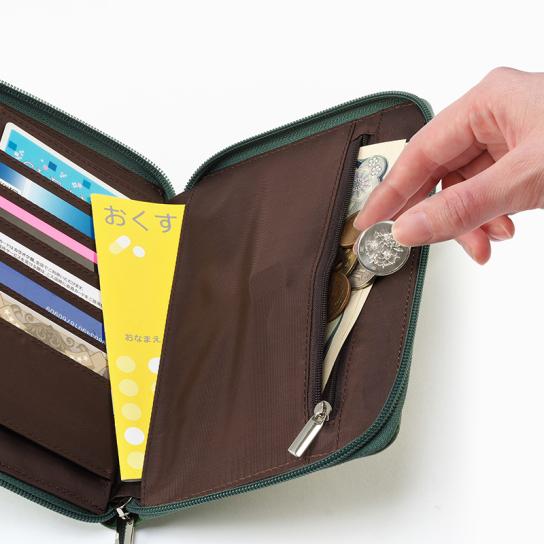 保険証・診察券・お薬手帳・処方箋・領収書などをまとめて収納できます。大きく開く仕様で中身が確認しやすく、お会計時に使えるお札や小銭も入ります。母子手帳や少量のお薬も収納できます。