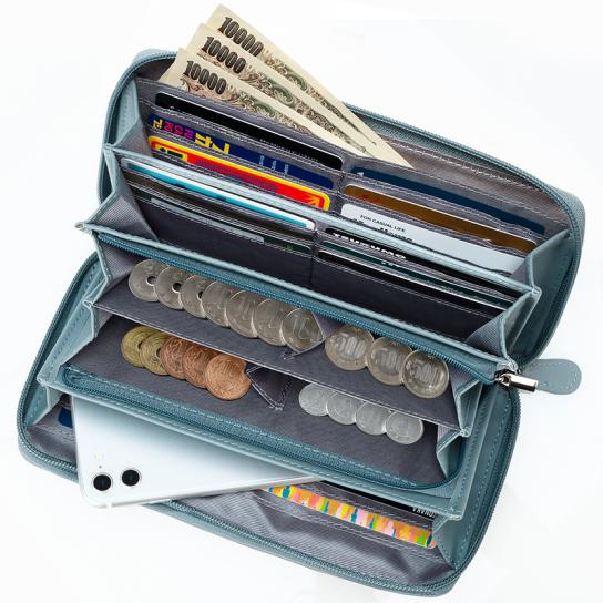 ファスナーを開くと中身が広く見渡せる構造で、必要なものをスムーズに取り出せます。カードや紙幣、小物などを整理しやすい設計です。