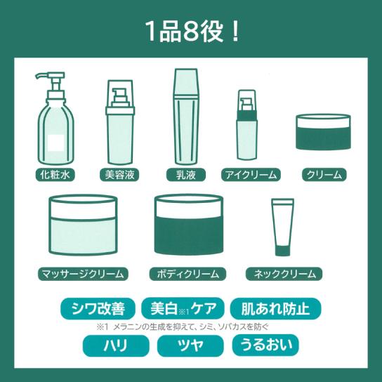 化粧水・美容液・乳液・クリーム・アイクリーム・ネッククリーム・マッサージジェル・ボディクリームの8役がこれひとつに!洗顔後のスキンケアから首・デコルテ・全身まで、効率よくケアできます。