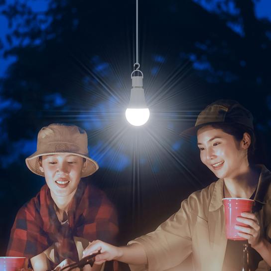 電球として普段使いしながら、停電時には取り外してライトとして使える充電池内蔵タイプのマルチ電球。一般的なE26口金に対応し、停電を自動で検知して点灯します。付属の吊り下げソケットを使えば、ランタンのようにも使えます。