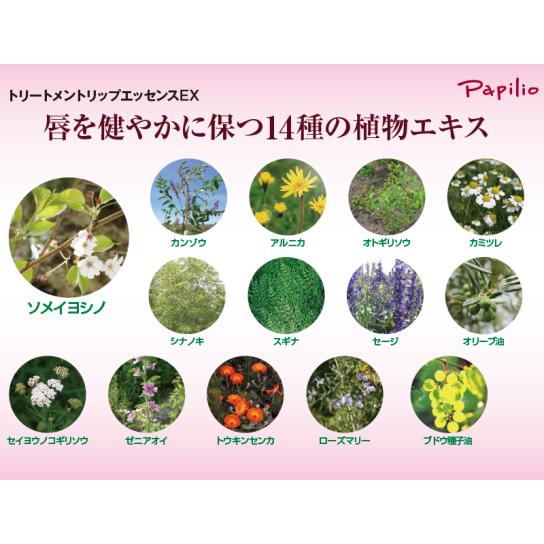 カンゾウやオリーブ油エキス、新たに加えたソメイヨシノ葉エキスなど14種類の植物エキス配合により、塗っている間中、唇のカサつきや荒れを防ぎます。