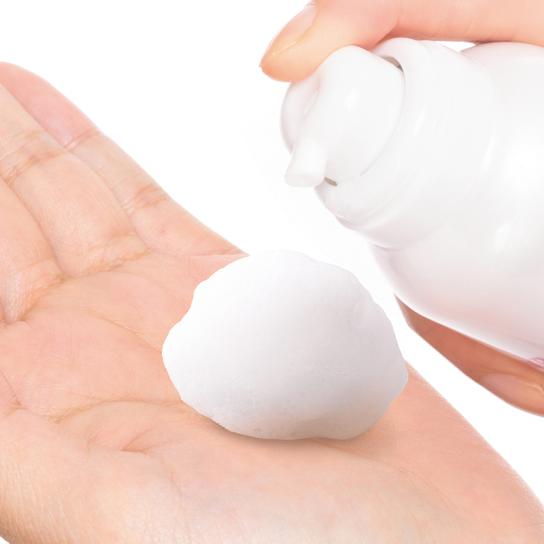 1.容器を上下によく振り、ボタンが上になるよう持ちます。手のひらにくぼみをつくり適量(ピンポン玉大)をスプレーし、泡を手のひらに軽く広げます。
