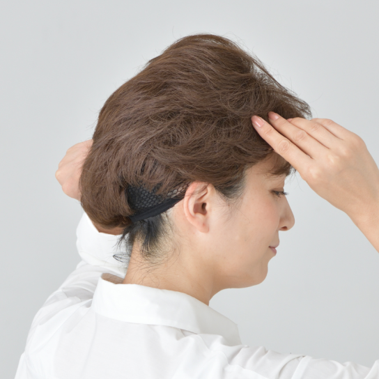 - 下地ネット等で自毛をまとめてからウィッグをかぶってください。ウィッグの内側前部分についている装着ピンで固定してご使用ください。