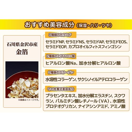 石川県金沢産の金箔をふんだんに使用。金がスーッと肌になじみ、伸びがよくてベタベタしないのが特徴です。ノバラの香りでリラックス気分を味わえ、ラグジュアリーな自宅エステ時間を作ります。お顔だけでなく乾燥の気になる首、デコルテ、腕、脚にもご使用ください。