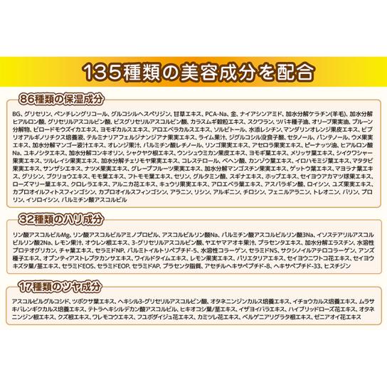 6種類のセラミド、2種類のヒアルロン酸、2種類コラーゲンをはじめ、レチノール、アミノ酸、プラセンタ、エラスチンなどのエイジングケア*成分を配合。保湿成分として、ツボクサ葉エキス、オリーブ果実油、リンゴ果実エキス、モモ葉エキスなど植物由来の成分を配合。トータルで135種類もの美容成分を配合し、乾燥が気になる方でも毎日の保湿でいつでもぷるぷるの肌を保ち、エイジングケア*を行う事ができます。