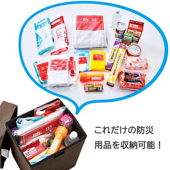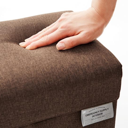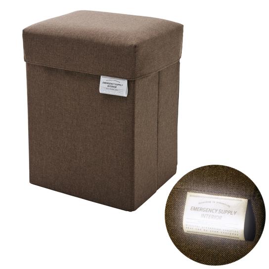 玄関に置いて使える座面付き収納チェア。内部には防災用品や衣類などを収納でき、日常の備えを“見える化”できます。座面にはウレタンクッション入りで、やさしい座り心地。フタは面ファスナー式で開閉も簡単。反射タグ付きで夜間の視認性も確保し、底面には滑り止め加工を施して安定感も抜群です。