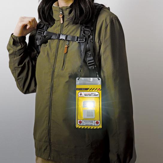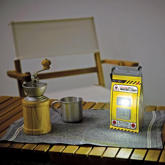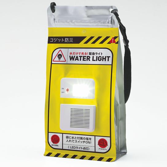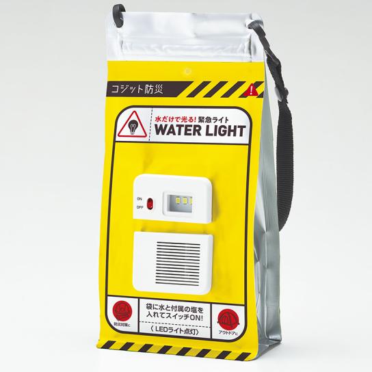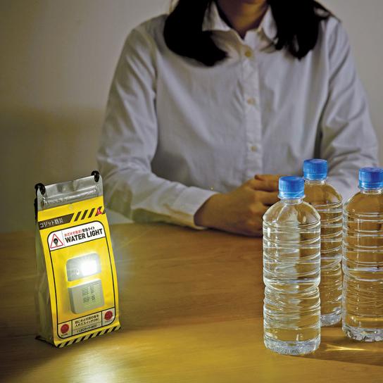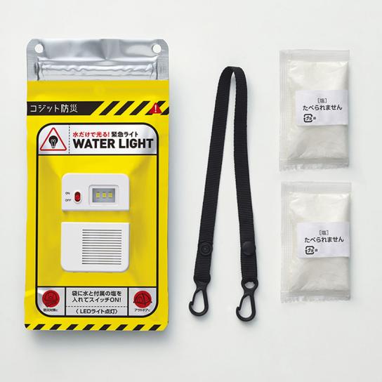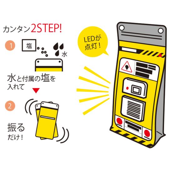 付属の塩と水を入れ、軽く振ることでLEDが点灯。電池を必要としないため、いざという時に準備しやすい仕様です。
