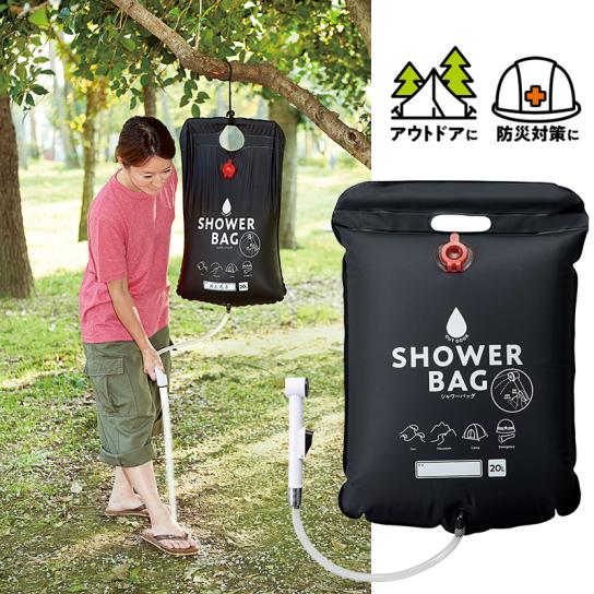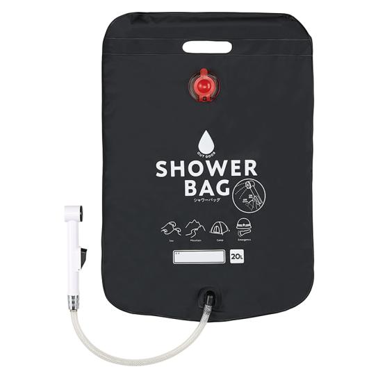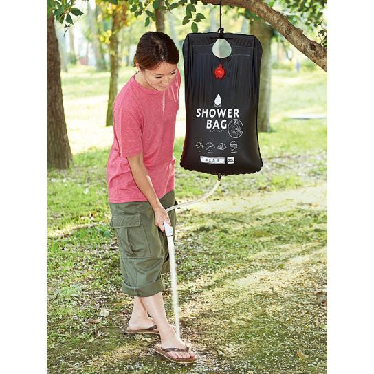アウトドアや災害時に活躍する、容量約20Lのポータブルシャワー。黒色の本体が太陽光を効率よく吸収し、内部の水を温めて快適に使用可能※。