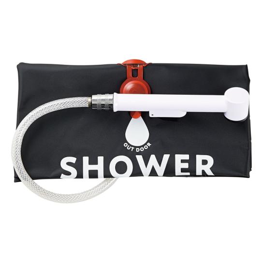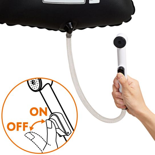 本体サイズは約41×60×57cmで、使用しない時は折りたたんでコンパクトに収納可能。フック付きロープで木の枝などに吊り下げて使用※でき、シャワー口のストッパー付きボタンを押すだけで水が出て、離すと止まる仕組み。手元で簡単に水量をコントロールできます。