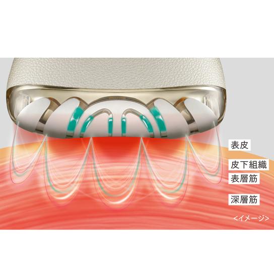 7つのワイドリフトヘッドが広範囲の表情筋に同時にアプローチ。低周波と高周波を組み合わせた独自波形EMSが、筋肉のストレッチ・揉み出し・収縮を繰り返し、深層筋までしっかり刺激します。