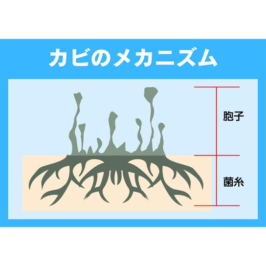 吹きかけた瞬間にカビの根っこまで浸透。繊維の染料を染み込ませるときに使う特殊な浸透剤を配合しているため、しっかりと浸透して根こそぎカビを取り除きます。奥までしっかり除去することで使用後はカビが生えにくい環境に。きれいが長持ちし、掃除の回数も減らせます。