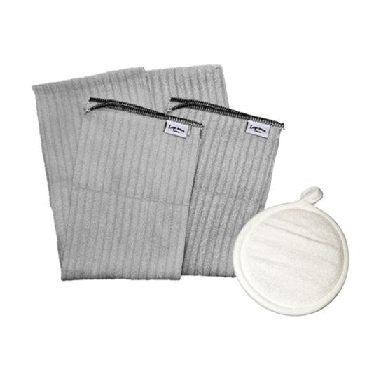 顔用はスポンジ入りで少しやわらかめ。ツイストループ繊維が、軽く擦るだけで不要な角質を絡めとります。