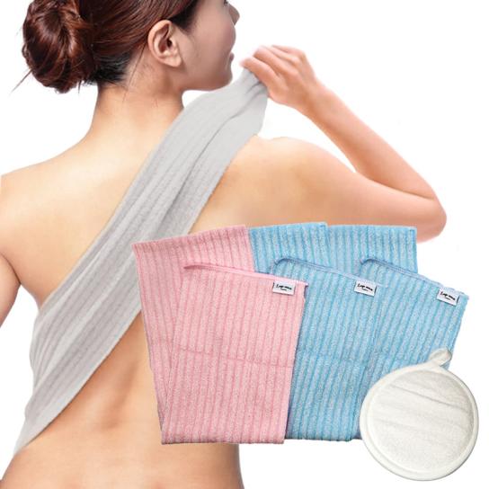 背中のケアにも使いやすい長さ90cmのロングサイズ。タオルなので指の間などの細かな部分にも使いやすく、ガサガサごわごわのひじやひざ、かかともこれ1枚でOK!頭部以外の全身ケアにお使いいただけます。
