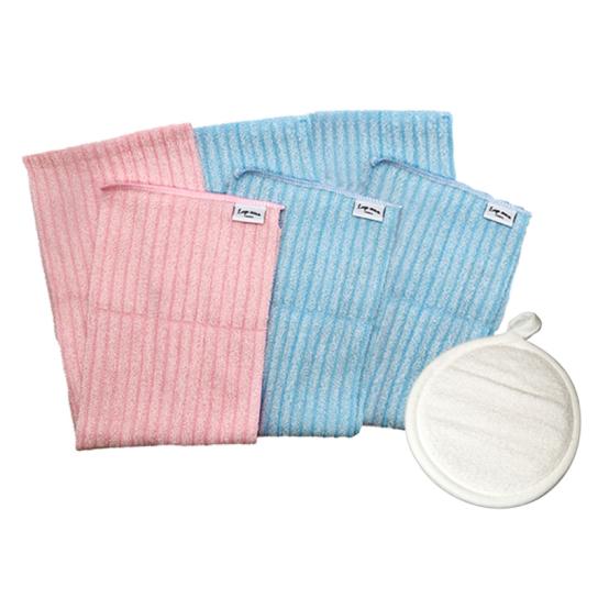 顔用はスポンジ入りで少しやわらかめ。ツイストループ繊維が、軽く擦るだけで不要な角質を絡めとります。