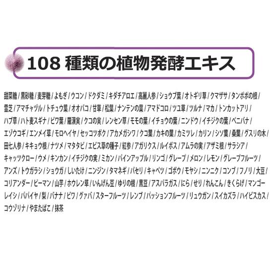 キャベツ・黒豆・生姜・高麗人参・クコの実など、野菜や果物が108種類も入った植物発酵エキス。大量の野菜に酵母を入れて発酵させた後、その酵素エキスを粉末化。少量でも野菜エキスはたっぷり。