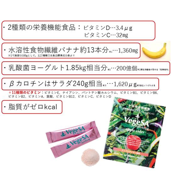 - 難消化性デキストリン(アメリカ製造)、還元麦芽糖水飴、果汁パウダー(リンゴ濃縮果汁、デキストリン、砂糖)、ブドウ糖、ベリーミックスパウダー(デキストリン、ブルーベリー果汁、ブラックカーラント果汁、レッドラズベリー果汁、アロニア果汁、リンゴンベリー果汁、アサイーエキス)、リンゴ抽出物、澱粉、乳酸菌(殺菌)、明日葉末、植物発酵エキス末/酸味料、重曹、ビタミンC、香料、甘味料(ステビア)、β-カロチン、抽出ビタミンE、ナイアシン、パントテン酸Ca、ビタミンB1、ビタミンB6、ビタミンB2、ビタミンA、ビタミンD、葉酸、ビタミンB12、(一部に大豆・バナナ・山芋・リンゴ・乳成分を含む)