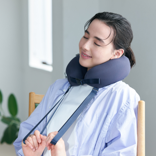 本体は軽量で、首に装着するだけで使用できるハンズフリー設計。コードレス仕様のため、場所を選ばず使用できます。ストラップを引くことで、強さや位置の調整も可能です。