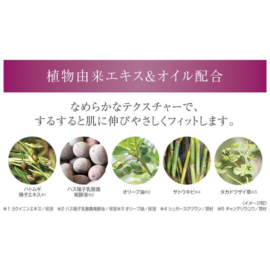 【その他成分】アセチル化ヒアルロン酸ナトリウム、ハス種子乳酸菌発酵液、ヨクイニンエキス、シュガースクワラン、オリブ油、天然ビタミンE、N-ラウロイル-L-グルタミン酸ジ(フィトステリル・2-オクチルドデシル)、2-メタクリロイルオキシエチルホスホリルコリン・メタクリル酸ステアリル共重合体、ジ2-エチルヘキサン酸ネオペンチルグリコール、トリ2-エチルヘキサン酸グリセリル、パラメトキシケイ皮酸2-エチルヘキシル、ポリエチレンワックス、重質流動イソパラフィン、酸化アルミニウム、セスキオレイン酸ソルビタン、マイクロクリスタリンワックス、軽質炭酸マグネシウム、微粒子酸化チタン、シリル化処理無水ケイ酸、水酸化アルミニウム、キャンデリラロウ、メチルポリシロキサン、メチルハイドロジェンポリシロキサン、タルク、1,3-ブチレングリコール、酸化チタン、マイカ、黄酸化鉄、黒酸化鉄、ベンガラ
