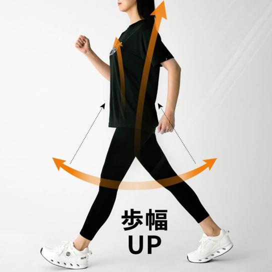 MAX約5cmの厚底設計により、脚のラインをすっきり見せる効果も。トゥアップ&ヒールレス形状がスムーズな重心移動をサポートし、歩幅を意識しやすく設計されています。