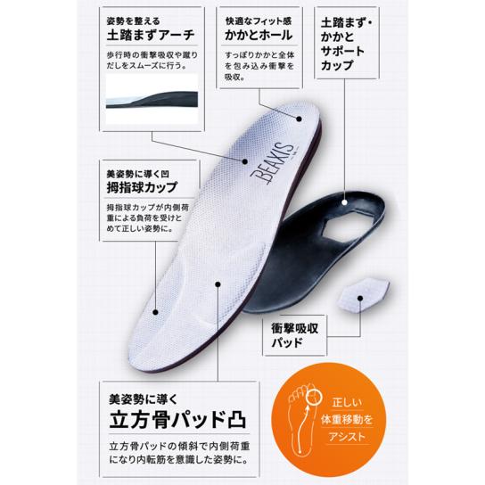 重心を整えるインソール×船底型ソールが内転筋を意識した美しい歩行へ導き、姿勢の安定をサポートします。