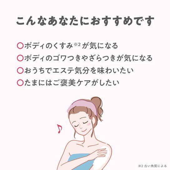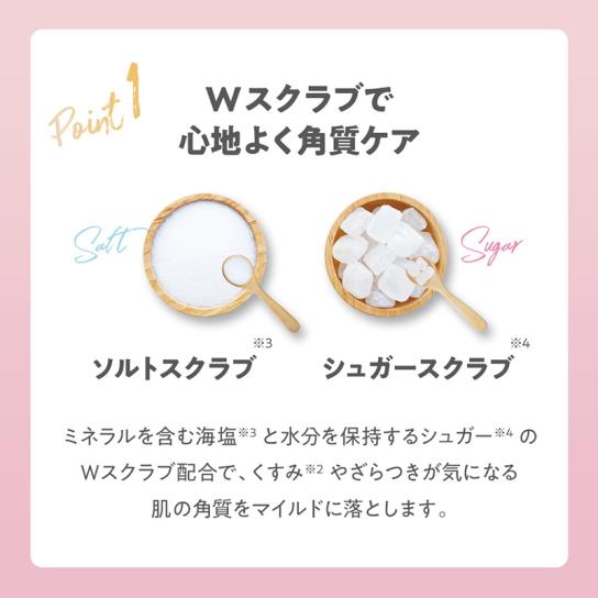 ミネラルを含む海塩(※1)と、水分保持力のあるシュガー(※2)のWスクラブを配合。肌への刺激に配慮しながら、くすみ(※3)やざらつきの原因となる古い角質をマイルドにケアします。