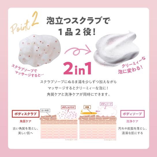 古い角質をスクラブでつるっと取り除き、美容成分を含むクリーミーな泡でそのまま洗浄ケア。やわらかな香りに包まれる癒しのバスタイムで、夏服から見える素肌をしっとりとなめらかに整えてくれます。
