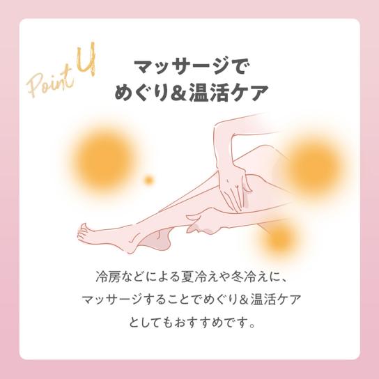 また、ショウガ根エキス(※5)、トウガラシ果実エキス(※5)を配合し、冷房などによる夏冷え対策としてマッサージ&温活ケアにもおすすめです。
