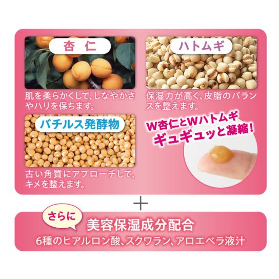 W杏仁(杏仁オイル・杏仁エキス)とWハトムギ(ハトムギオイル・ハトムギエキス)で浸透(※2)角質ケアを実現。 ぷるぷるのジェルに、角質ケア・うるおい・ハリ・キメ・しなやかさの5つの働きをぎゅっと凝縮。肌をやさしく包み込みながらうるおいを与え、なめらかで整った肌へと導きます。