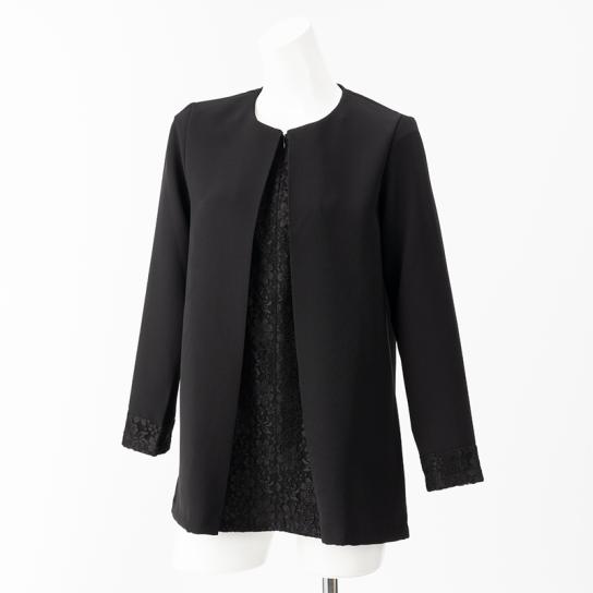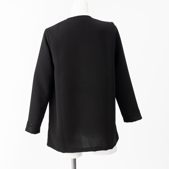 チュニックの前身頃には、ブラウスを重ね着しているように見える上品なレースデザインを採用。ジャケットのような見た目で、きちんと感がありながら女性らしい華やかさを演出します。肩パット付きで姿勢も美しく見せてくれます。