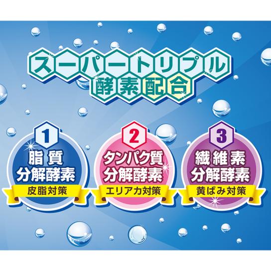 汚れを落とす力には、自然界にある菌が作り出す発酵液を配合しています。そして3つの酵素がタンパク質・油汚れ・繊維付いた汚れを強力に洗浄。一度にたくさんの衣類を洗濯しても汚れ戻りがないのが最大の特徴です。