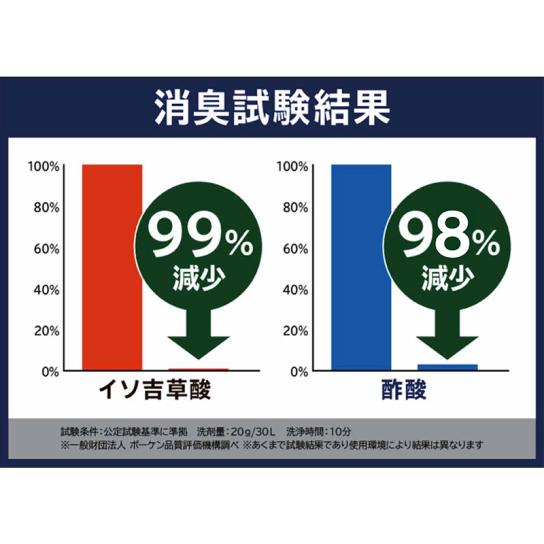 - 界面活性剤(0.5%ポリオキシアルキレンアルキルエーテル)、アルカリ剤、水軟化剤、分散剤、再汚染防止剤(カルボキシメチルセルロース)、酵素、植物性脂肪酸、消臭抗菌成分