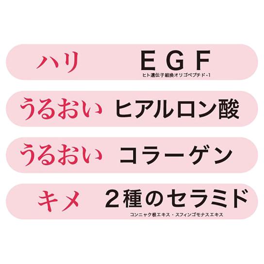 また、高級美容成分「EGF」や、ヒアルロン酸、米セラミド、コラーゲン、褐藻エキス、甘草エキスなど肌が喜ぶ成分を贅沢に配合。肌の乾燥を防いでキメを整えます。
