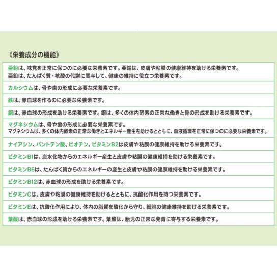 イノシトール 87mg、パラアミノ安息香酸 85mg、コリン 85mg、パントテン酸 17mg、レシチン 13mg、ビタミンB1 12mg、ビタミンB2 12mg、ナイアシン 12mg、ビタミンB6 10mg、葉酸 200μg、ビオチン 85μg、ビタミンB12 17μg