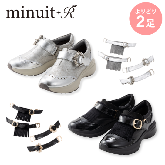 革靴風スリッポン、ビジュー付きベルト、ハラコ風フリンジベルトの3種類のデザインを1足で楽しめます。カジュアルからドレッシー、冬の装いまで幅広くご使用いただけます。