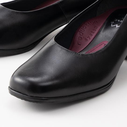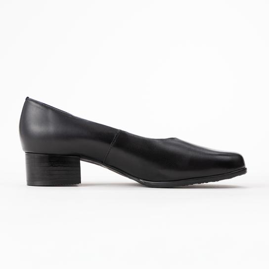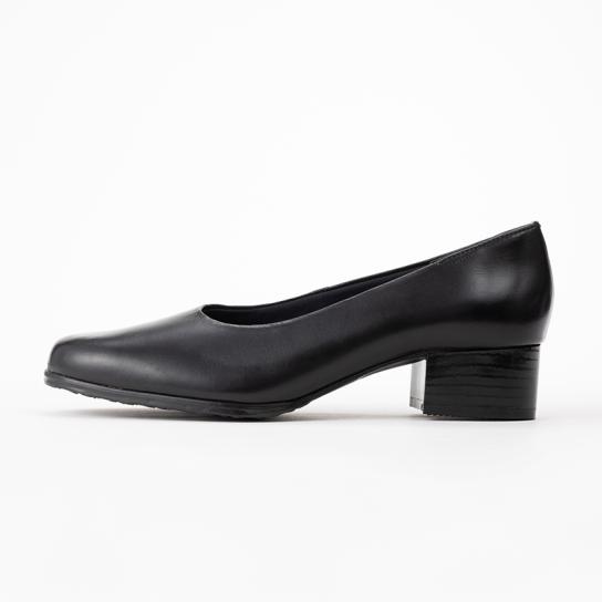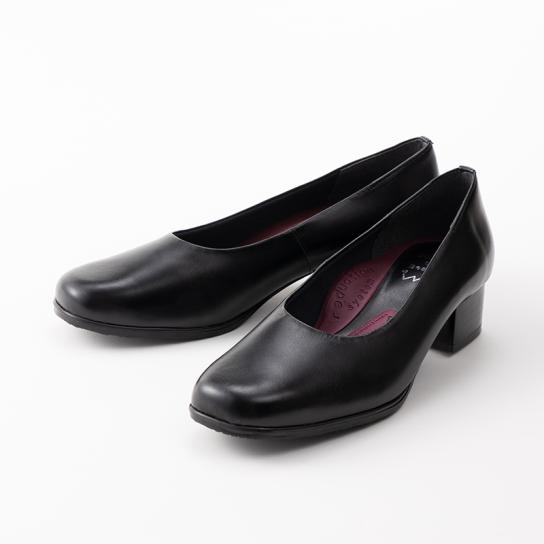 日本製の本革を使用し、国内で丁寧に縫製された幅広設計のパンプスです。ヒール高は3.5cmと低めながら、安定感のある太ヒールで歩きやすく、日常使いにぴったり。シンプルでベーシックなデザインは、幅広いシーンに対応します。