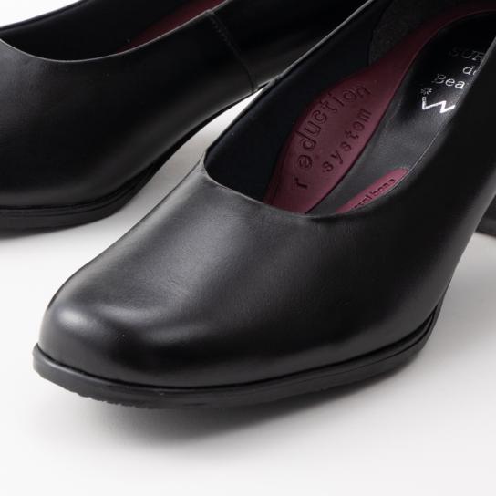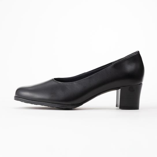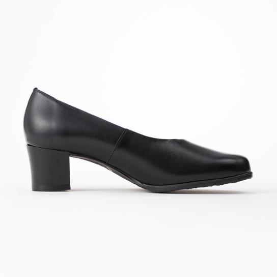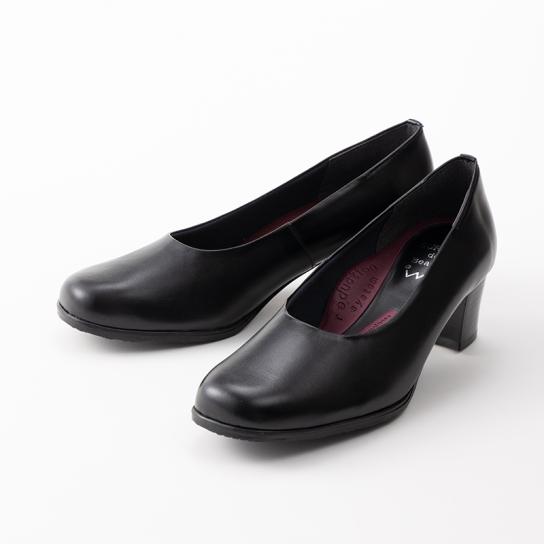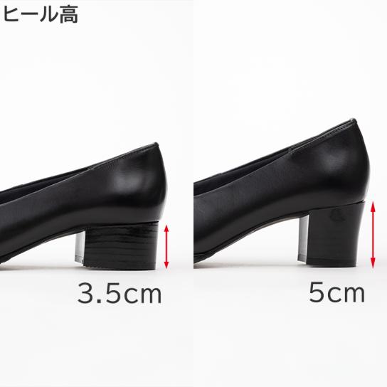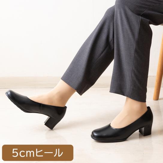 エレガントな印象を与える5cmヒールながら、安定感のある太ヒールで歩きやすさも兼ね備えたパンプスです。日本製の本革と国内縫製にこだわり、幅広設計で足にやさしい履き心地を実現。フォーマルにもカジュアルにも使える万能な一足です。