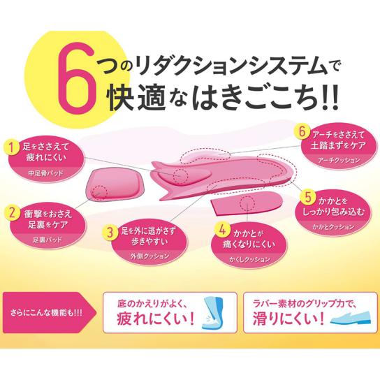 中足骨パッド・足裏パッド・外側クッション・かかとクッション・アーチクッションなど、足の構造に合わせたサポート機能を搭載。足への負担を軽減し、快適な履き心地を実現します。