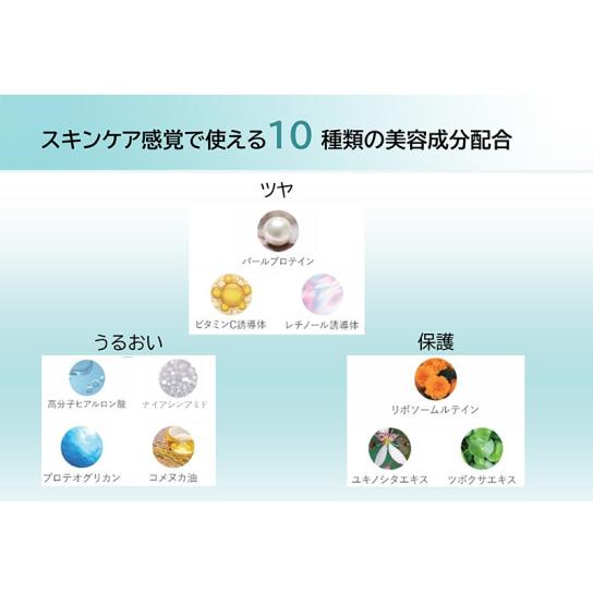 SPF50+、PA++++のUVカット機能を備え、顔だけでなく首元やデコルテ、手の甲などにも使用できます。パールプロテイン、プロテオグリカン、ビタミンC誘導体(※1)などの美容成分に加え、ナイアシンアミド(※2)を配合し、肌のうるおいを保ちながらメイクをサポートします。ウォータープルーフ仕様で、水や汗に配慮した設計です。